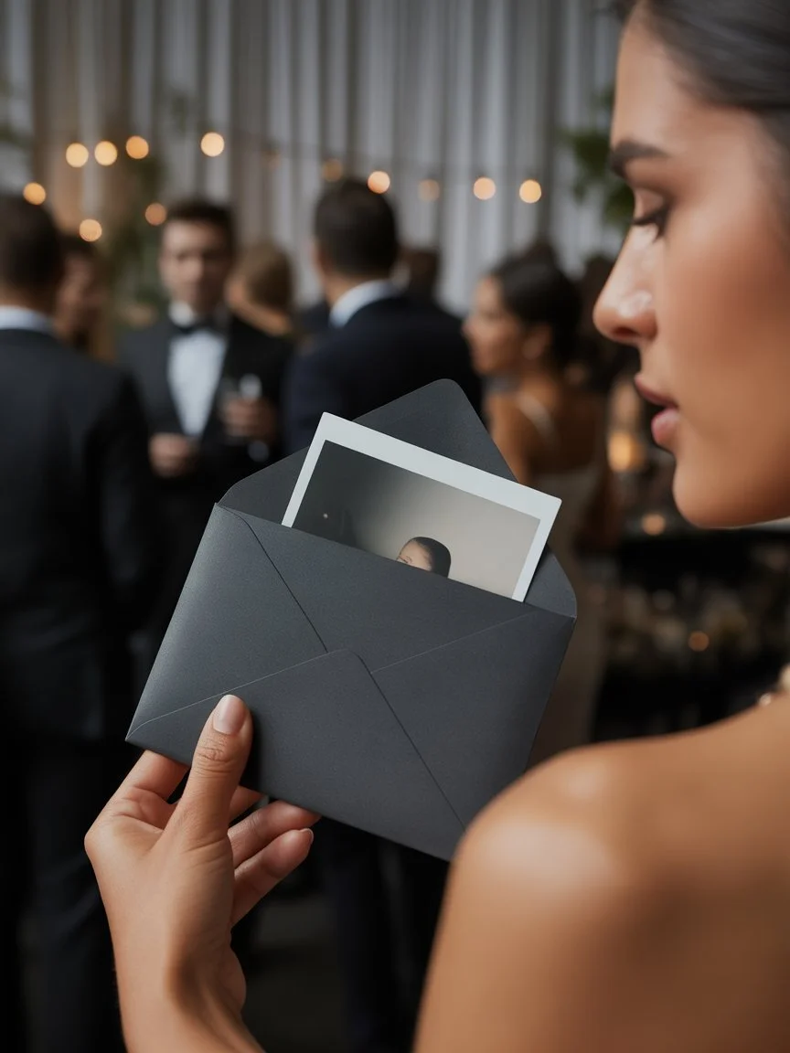 Each Polaroid is placed inside a sealed envelope or presentation sleeve while it develops. Guests wait a few minutes before opening it, turning a simple photograph into a moment of anticipation.